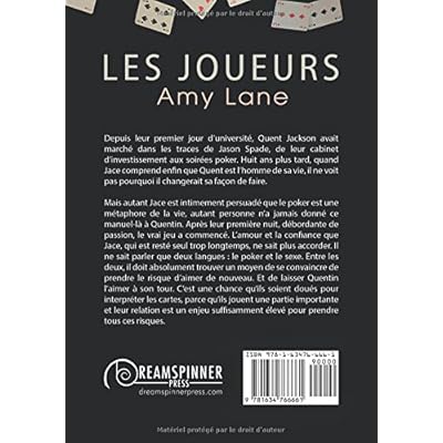 Depuis leur premier jour d'universite, Quent Jackson avait marche dans les traces de Jason Spade, de leur cabinet d'investissement aux soirees poker. Huit ans plus tard, quand Jace comprend enfin que Quent est l'homme de sa vie, il ne voit pas pourquoi il changerait sa facon de faire. Mais autant Jace est intimement persuade que le poker est une metaphore de la vie, autant personne n'a jamais donne ce manuel-la a Quentin. Apres leur premiere nuit, debordante de passion, le vrai jeu a commence. L'amour et la confiance que Jace, qui est reste seul trop longtemps, ne sait plus accorder. Il ne sait parler que deux langues: le poker et le sexe. Entre les deux, il doit absolument trouver un moyen de se convaincre de prendre le risque d'aimer de nouveau. Et de laisser Quentin l'aimer a son tour. C'est une chance qu'ils soient doues pour interpreter les cartes, parce qu'ils jouent une partie importante et leur relation est un enjeu suffisamment eleve pour prendre tous ces risques.